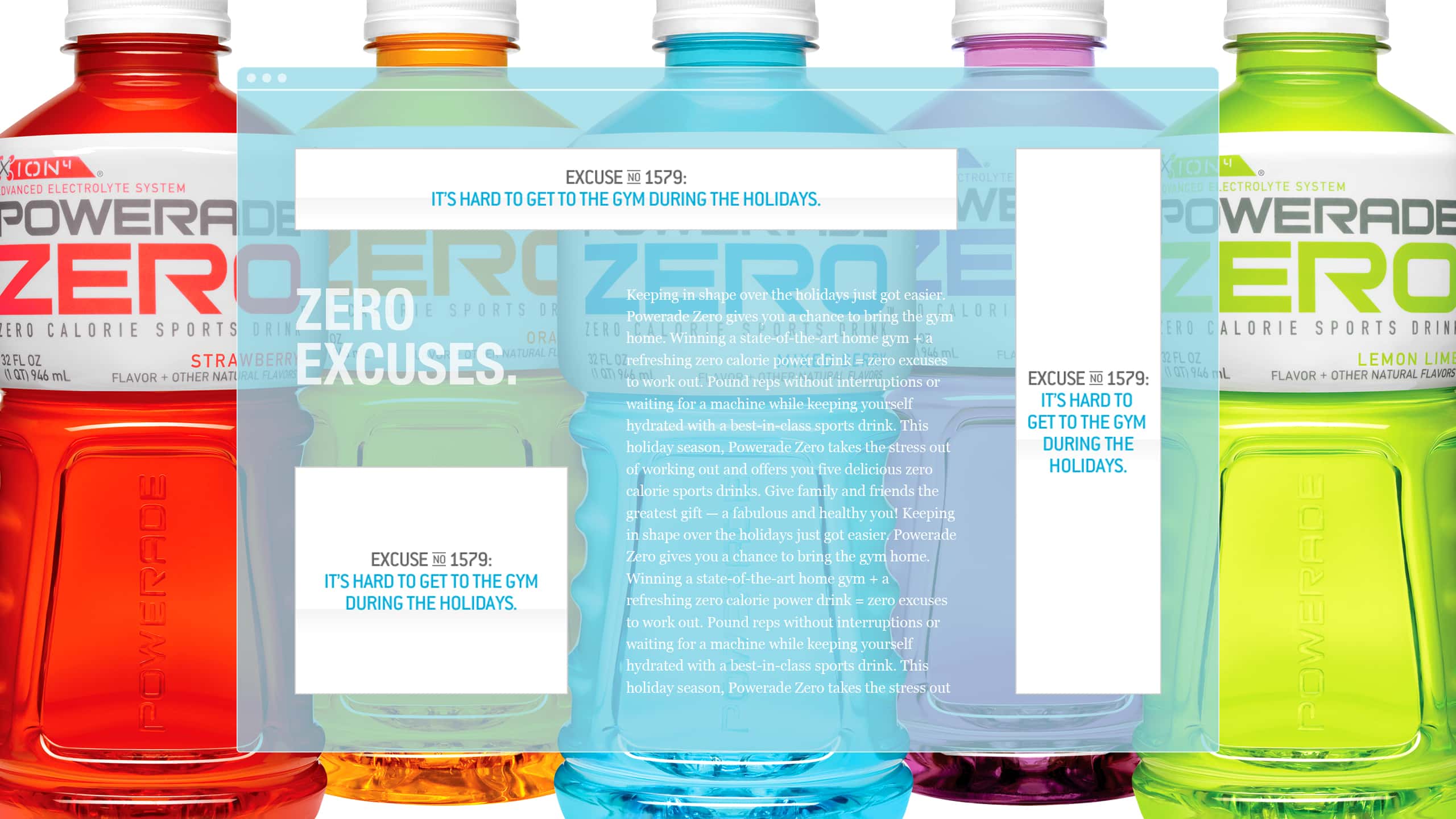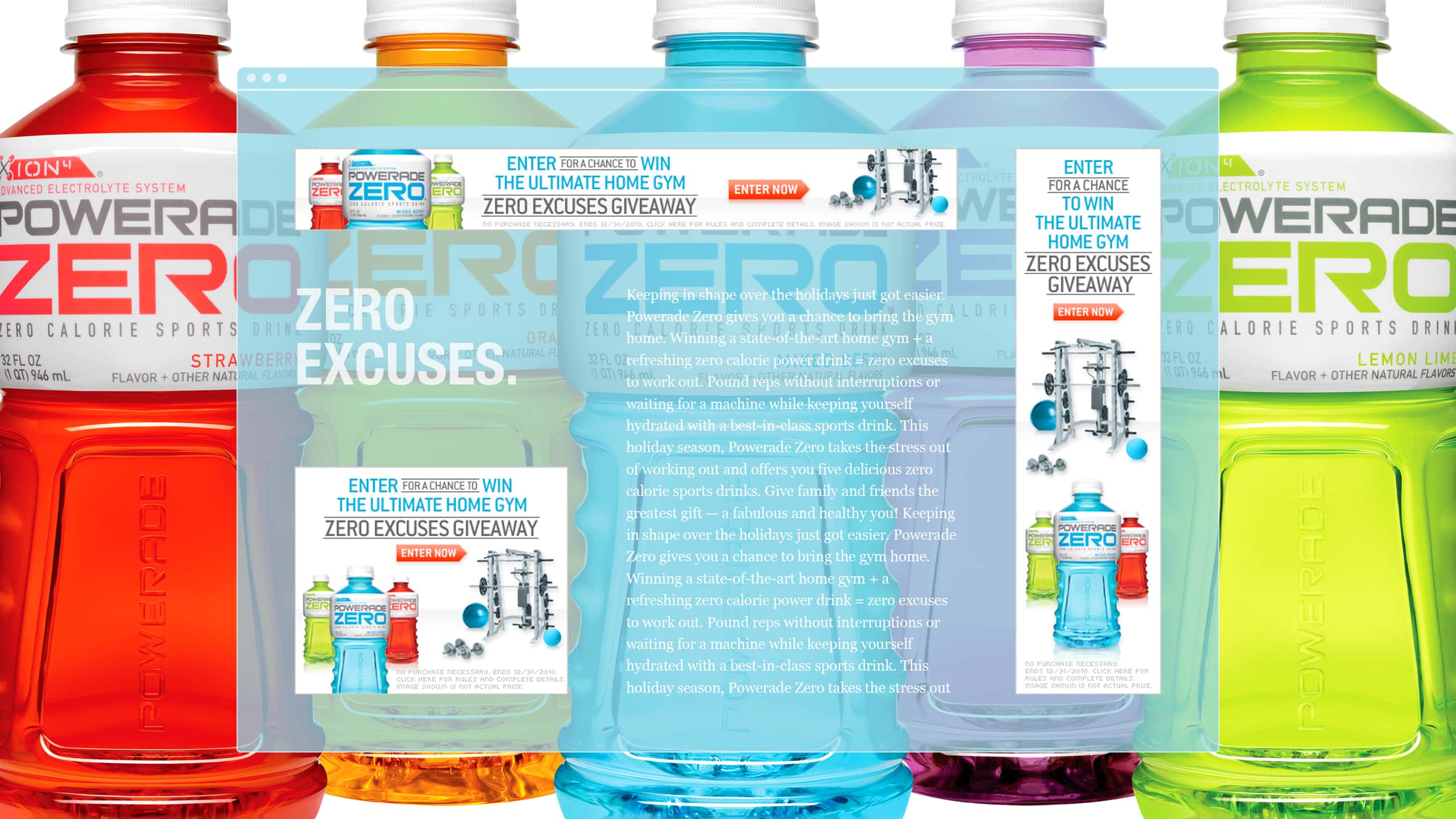 Keeping in shape over the holidays just got easier. Powerade Zero gives you a chance to bring the gym home. Winning a state-of-the-art home gym + a refreshing zero calorie power drink = zero excuses to work out. Pound reps without interruptions or waiting for a machine while keeping yourself hydrated with a best-in-class sports drink. This holiday season, Powerade Zero takes the stress out of working out and offers you five delicious zero calorie sports drinks. Give family and friends the greatest gift — a fabulous and healthy you!